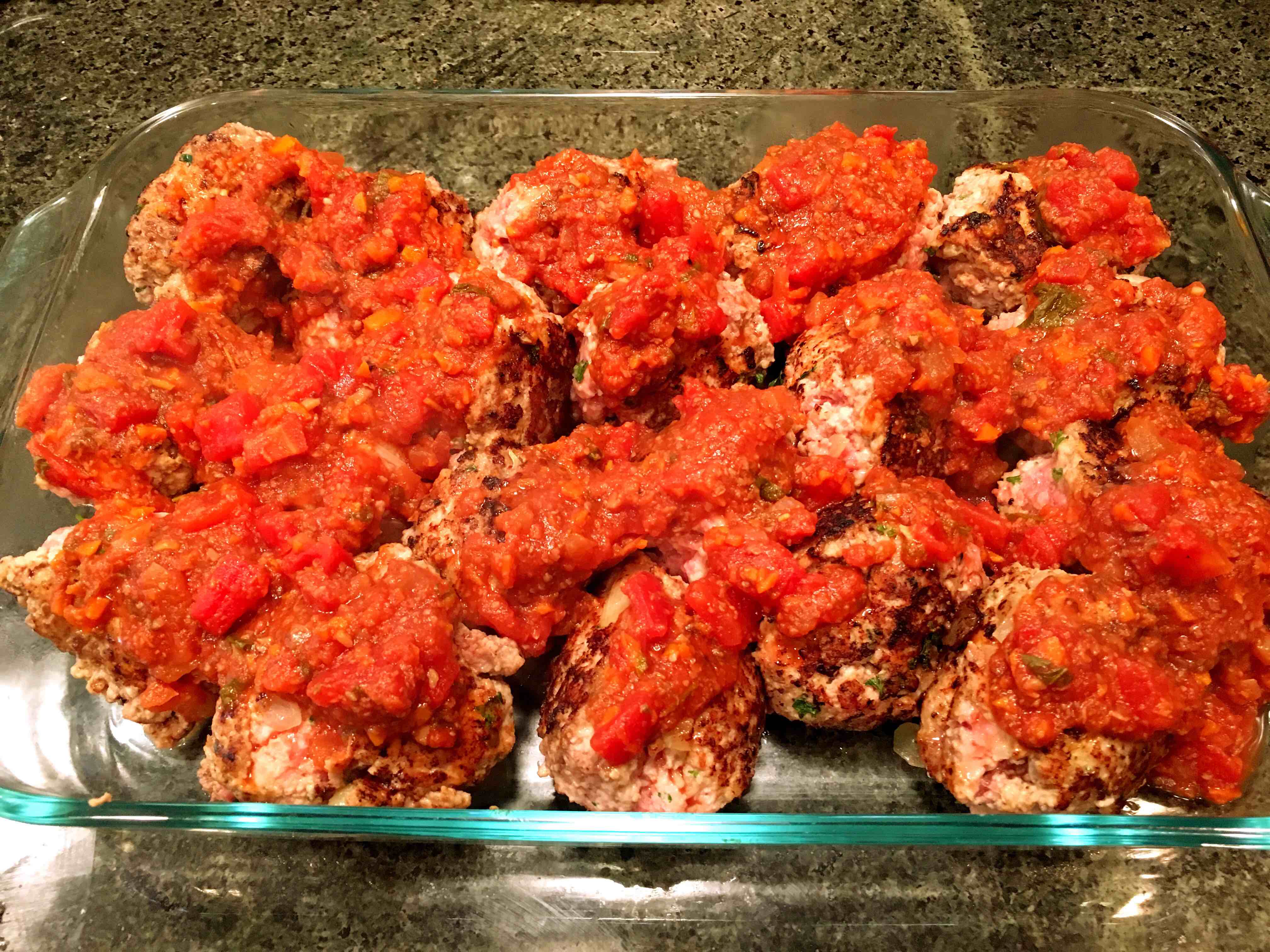 Lightly form the mixture into balls roughly the size of a large egg. In the pan you started with, “fry” the Turkeyballs on each side for 90 seconds. Place seared Turkeyballs into a glass cooking dish and top with a small amount of The Hubby Chef Spaghetti Sauce.