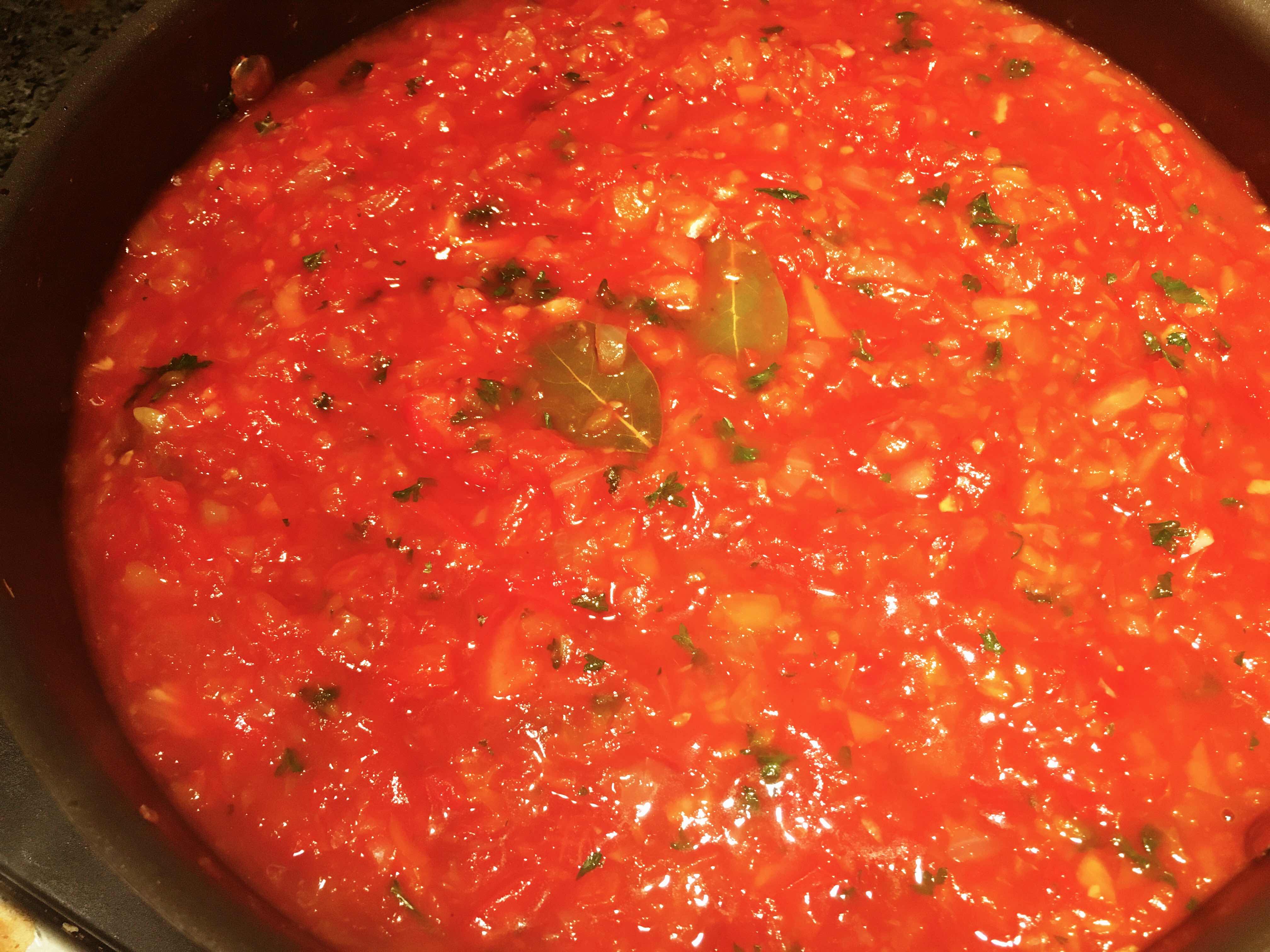 This recipe looks like it has a LOT of chopping, but I use my food processor for this one. The vegetables all combine to a wonderment of mush anyway, and trust me that’s a good thing. Make sure to use fresh tomatoes. Canned will make this too mushy, and that’s bad.