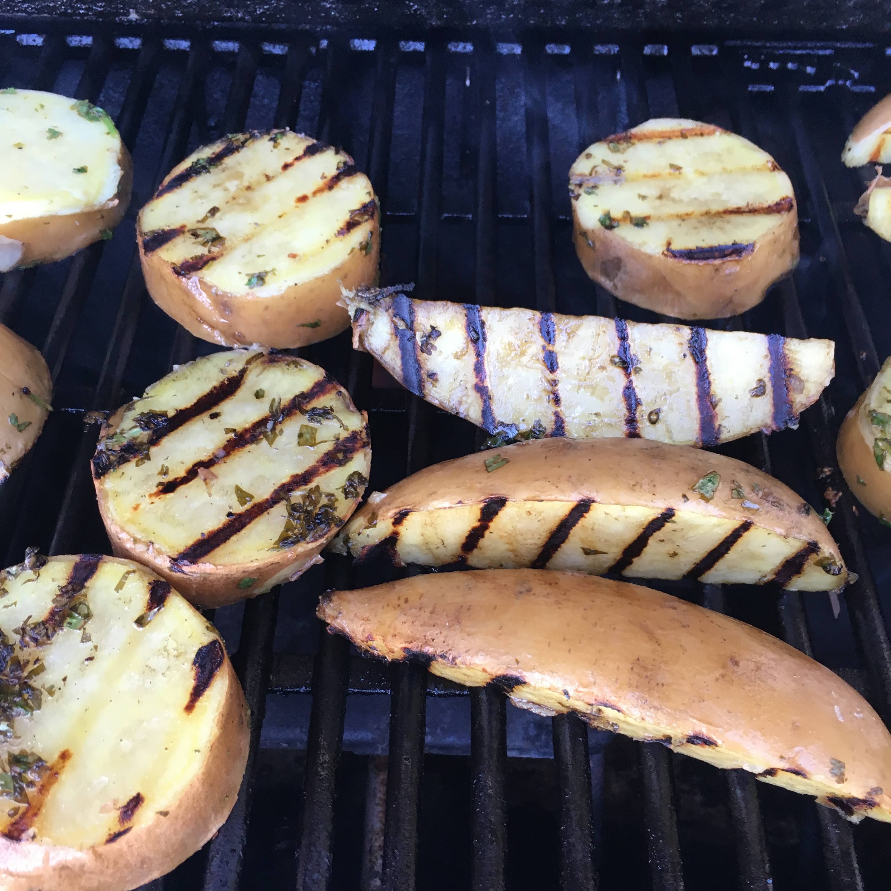 I much prefer the white sweet potato (often called yams) to the orange colored ones. It’s a little firmer and holds up better on the grill as well. There are also purple ones out there so just go crazy!