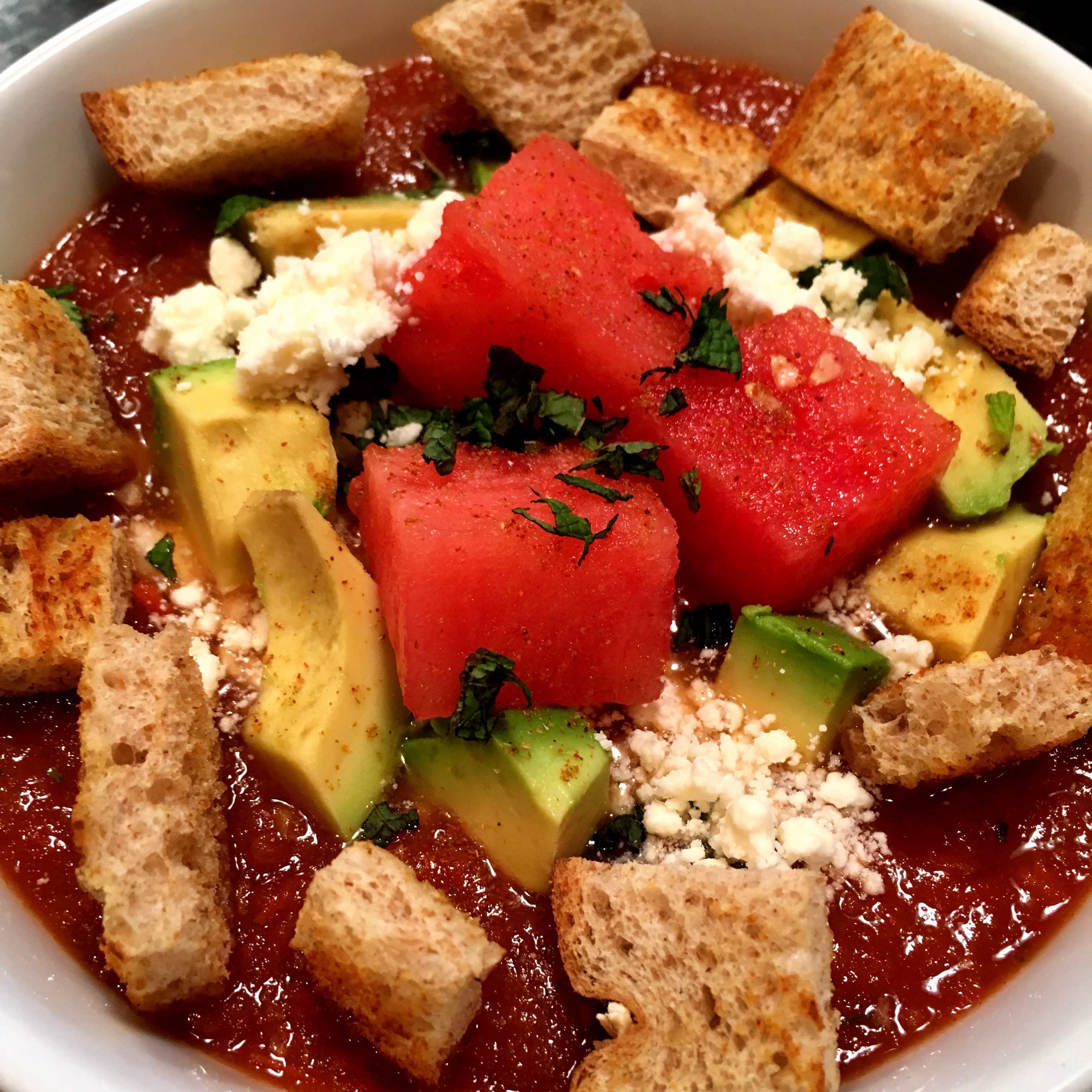 a few watermelon cubes and croutons. Dust the toppings, concentrating most of it on the watermelon cubes, with this mixture:
