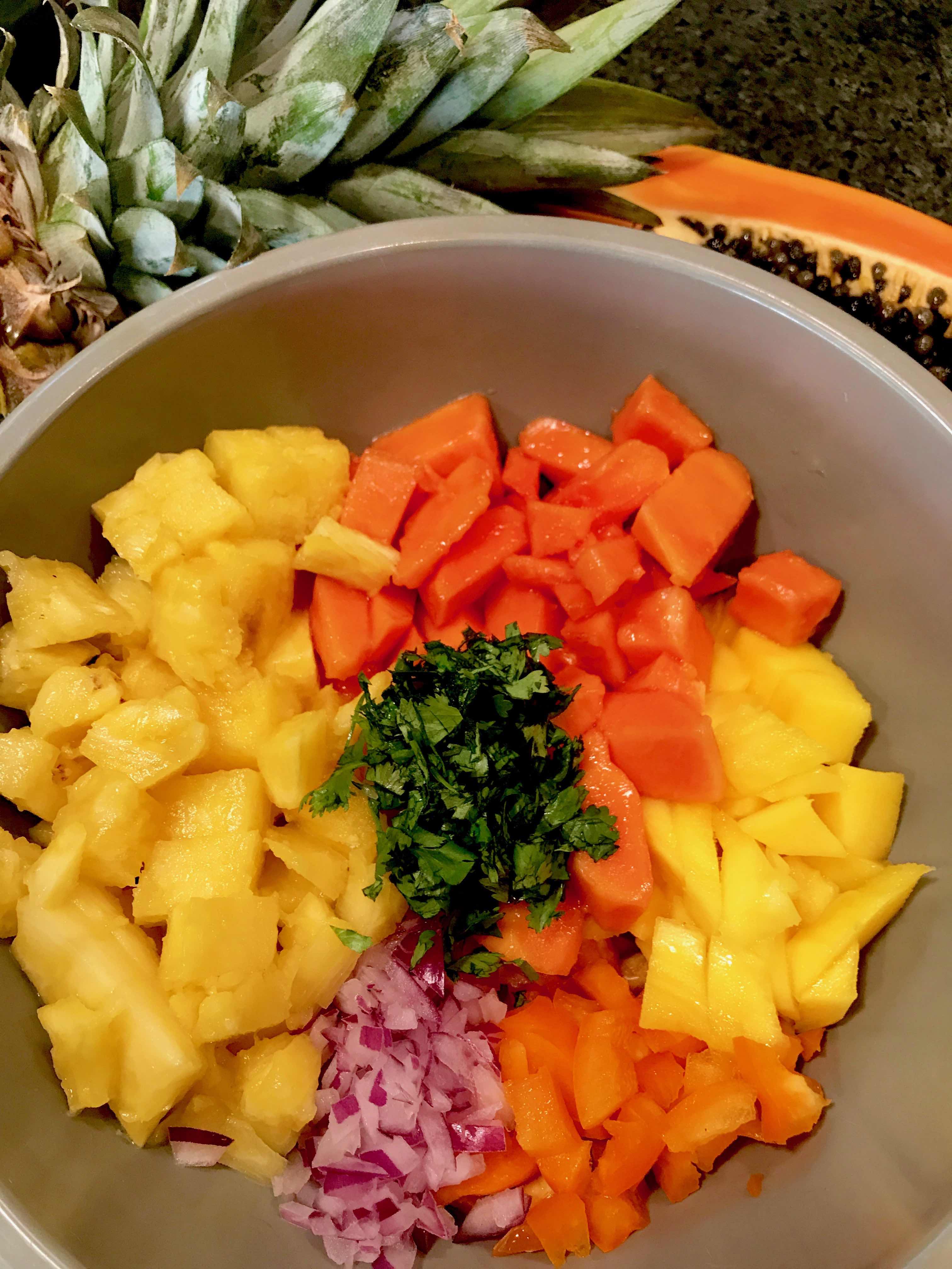 My wife doesn’t like spicy food but a quarter of diced fresh jalapeño would really make this sing. You can also add 1/2 cup of chipped Kiwi.