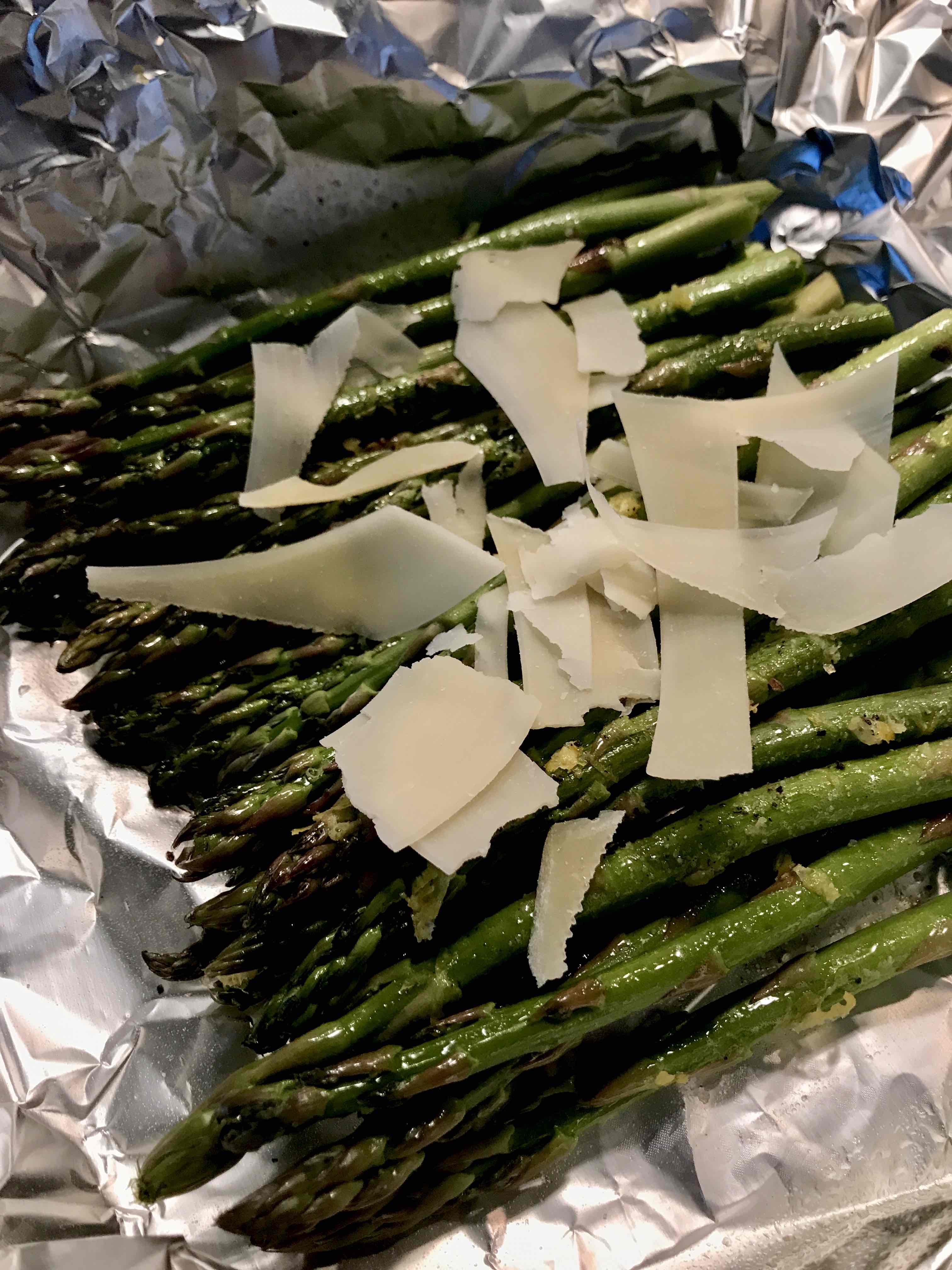 Place the asparagus on the foil and coat with the olive oil spray. Grate the lemon zest and dust with garlic salt. Salt and pepper and add the parmesan. Fold up the edges and seal the foil pouch.